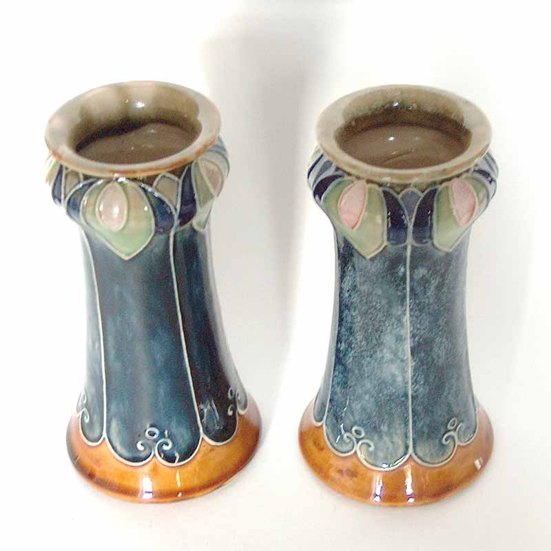 Two very similar 17cm tall Royal Doulton Art Nouveau stoneware vases by two different topline ceramic artists.