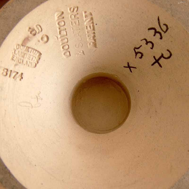 If you look on page 178 of Desmond Eyles' 'The Doulton Lambeth Wares', you will see a vase just like these: they're a different colour, but the design is exactly the same. Desmond Eyles dates them to about 1890. These two have the Doulton Lambeth mark with 'England', and so must be post-1891. As well as a host of other marks, the vases have the early monogram of Florrie Jones, and one has the impressed mark of Amy George.