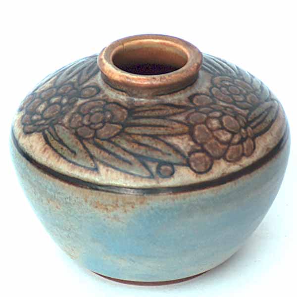 A 6.5" (16cm) diameter and 5" (12.5cm) tall Royal Doulton Stoneware vase in 'Arts and Crafts' style by Harry Simeon and Florrie Jones. This vase illustrates the development of Doulton design from the Victorian, through the Art Nouveau and Art Deco styles to the earthiness in texture and colour of the Arts and Crafts movement.