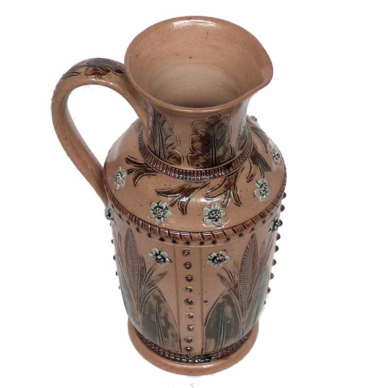 A very early Doulton Lambeth 8.5in (21cm) ewer by one of the rarest of the first group of Doulton’s top class designers – Emily Edwards. Probably made in 1871/2, this is a ‘must have’ for the collector making a comprehensive collection of the whole spectrum of early Doulton design. The ewer has the early Doulton Lambeth oval mark dating it to first years of the 1870s. It is signed in monogram by Emily Edwards and an unknown assistant. The vase weighs 665g.