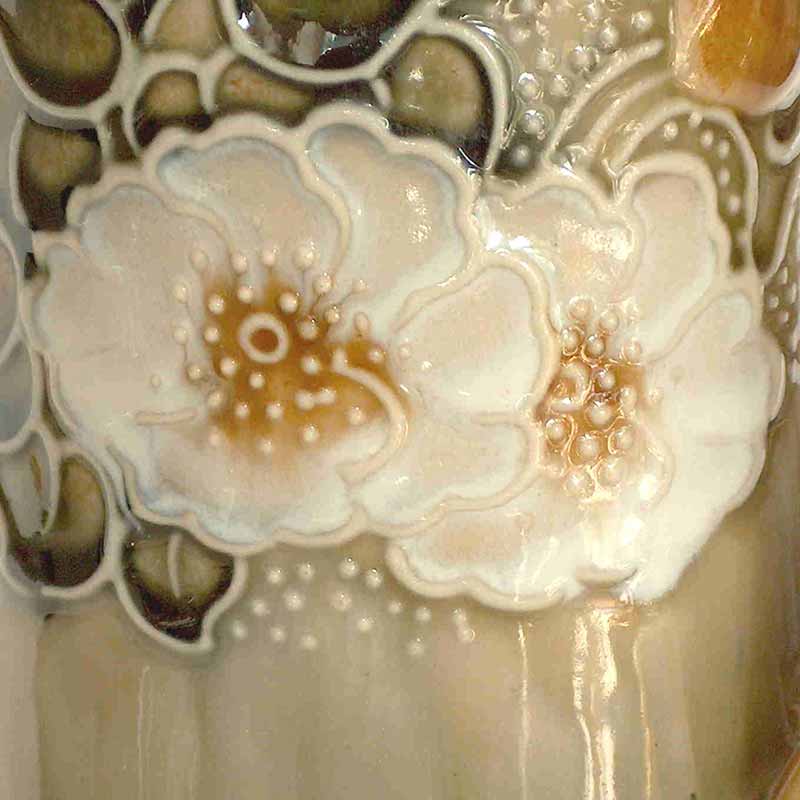 Bessie Newbery and Florence Roberts worked for Doulton for over 90 years between them and were considerd to be two of the finest ceramic artists. Very fortunately, the jug has its original counterweighted lid with it. The jug is in perfect condition with no chips, cracks, crazing or restoration. The lid has one small dent in the top and the plating has dulled.